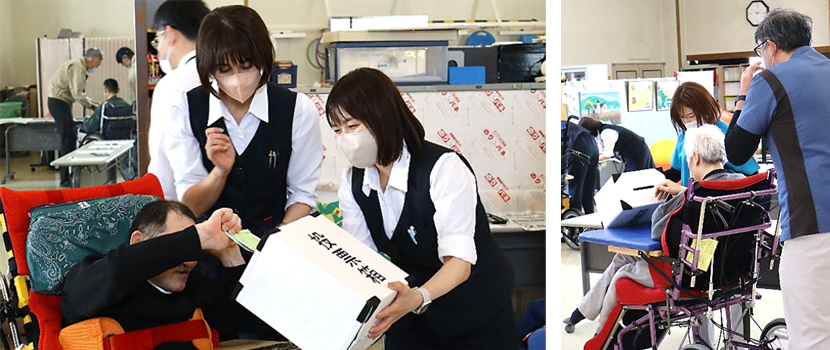 不在者投票管理者、立会人が見守る中、補助者の補助を受け、35名の利用者さんが選挙権を行使しました。